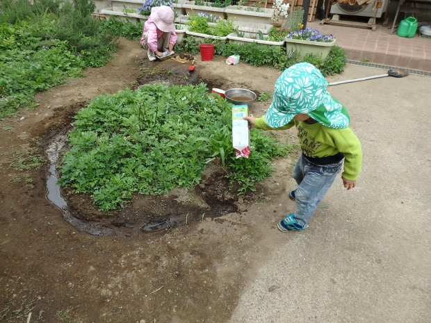 土を耕し、掘り進め、大きな川や池を作り、葉っぱの船を浮かべたり、堰をつくって、水の流れを生み出したり、互いが協力して土を掘る人、水を運んでくる人と、遊びの中で人間的なかかわりがしっかりと育まれています。)