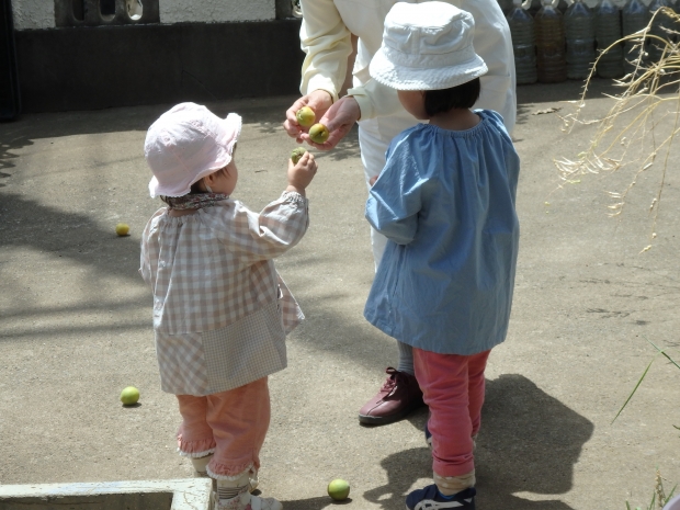 6月上旬には、梅の実がたわわに実り、収穫のときを迎えました。子どもたちは、毎日、ポトンと落ちてくる実を集め、おいしいご馳走を作ったり、大切に先生のエプロンに届けてくれます。シートを広げて収穫のお手伝い。どきどきはらはらしながら、実をたくさん収穫することができました。3度の収穫を終えて、梅の長く伸びた枝を剪定すると、早速、葉っぱはお茶作り、枝は釣竿に大変身。せっせと皮をむいていました。